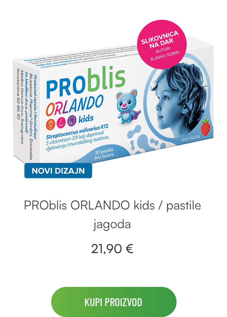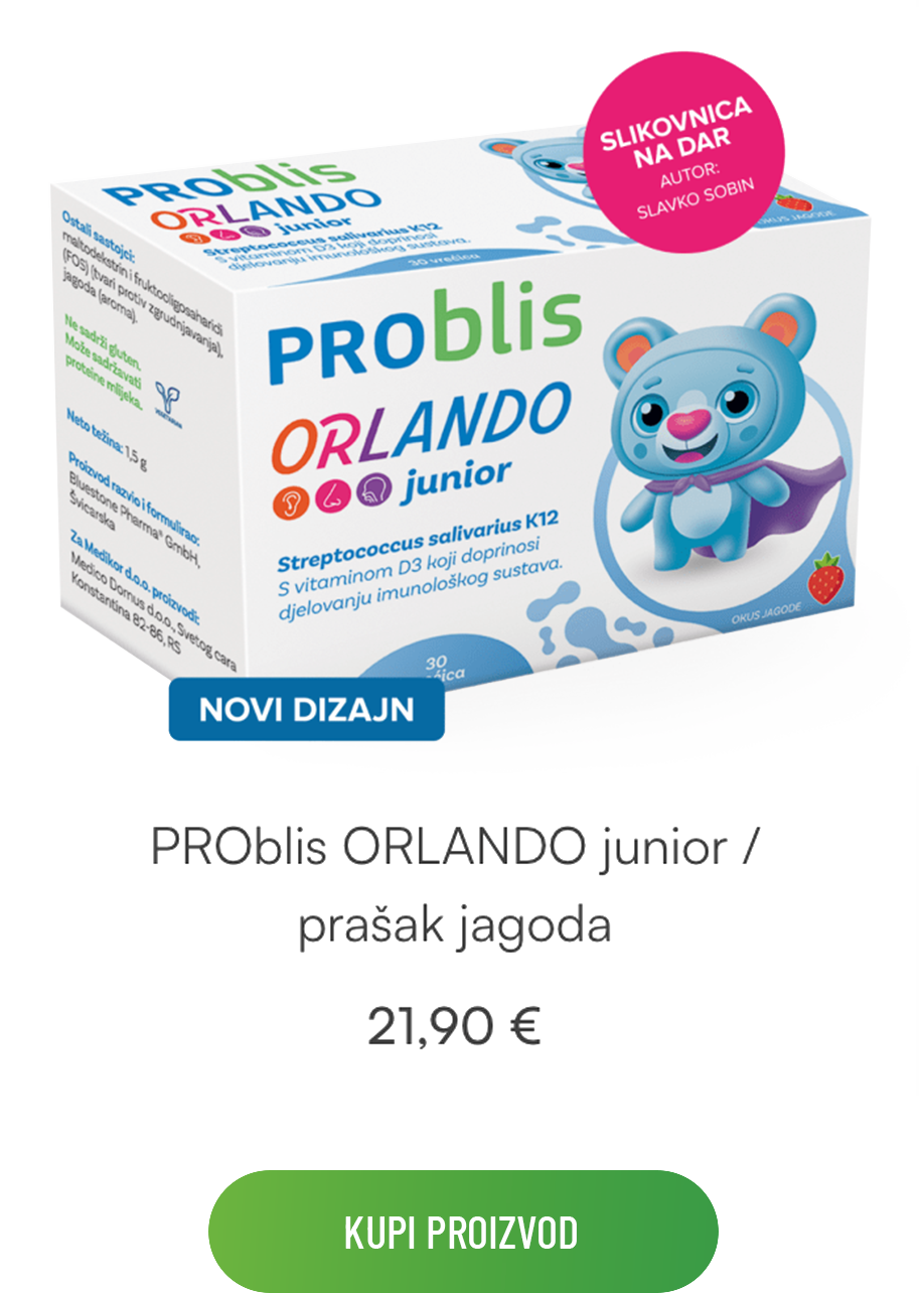 Dodatak prehrani za djecu koji sadrži premium bakterijski soj Streptococcus salivarius K12 te vitamin D3 za manje infekcija* uha, grla i nosa.