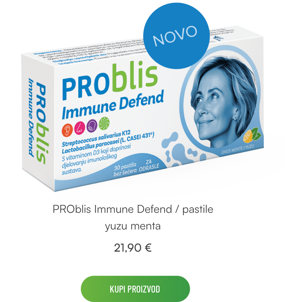 Prvi dodatak prehrani na tržištu koji sadrži bakterijski soj Streptococcus salivarius K12 i L. CASEI 431®. PROblis Immune Defend pruža sinergijsko djelovanje klinički dokazanih, premium bakterijskih sojeva za manje respiratornih infekcija odraslih.